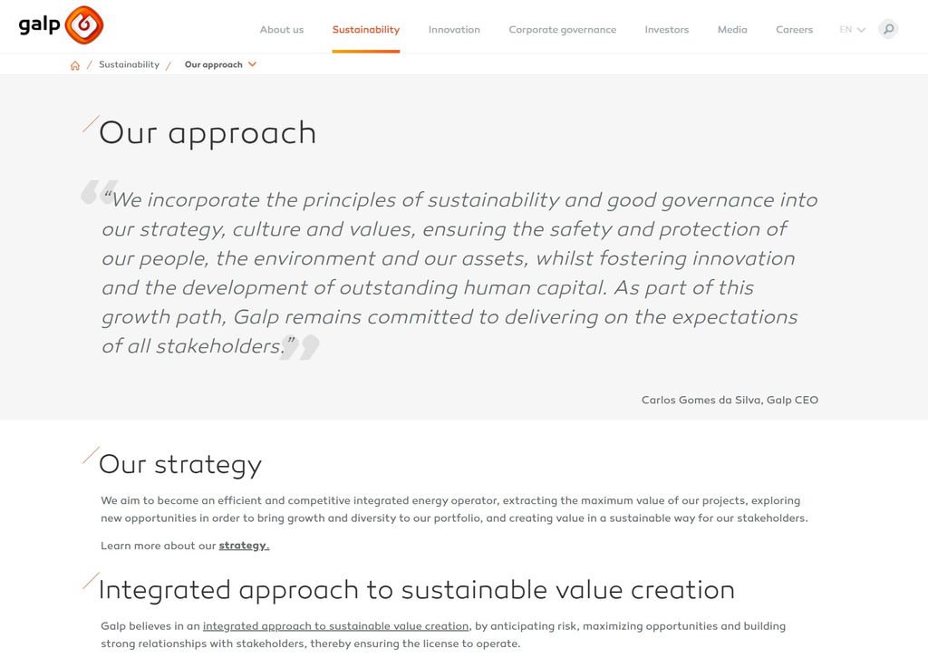 Portuguese energy company Galp Energia introduce their integrated approach to sustainable value creation with a statement from their CEO, which adds weight to the strategy. His input makes it clear that sustainability is not merely integrated into the business objectives, but also into the corporate values of the entire organisation.